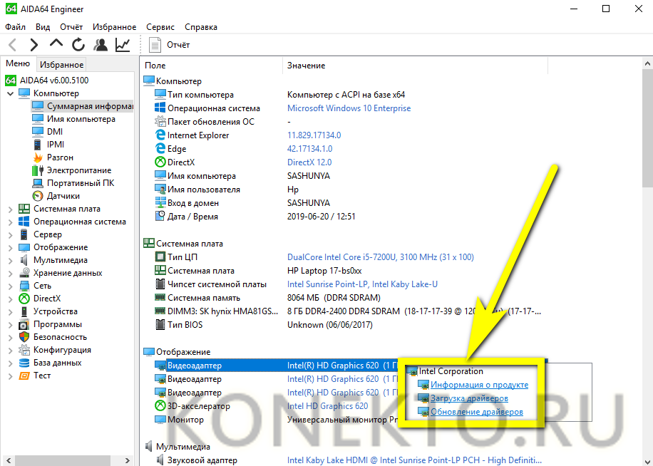 Кликнув по оформленному в виде ссылки заголовку продукта, пользователь сможет обновить драйвер устройства или получить о нём больше сведений, перейдя на сайт производителя.