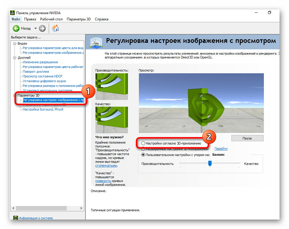 1. Запустите «Панель управления NVIDIA» и перейдите в раздел «Настройка параметров изображения с помощью браузера», где установите переключатель в положение «Устанавливать на основе 3D-приложения». Затем нажмите «Применить».