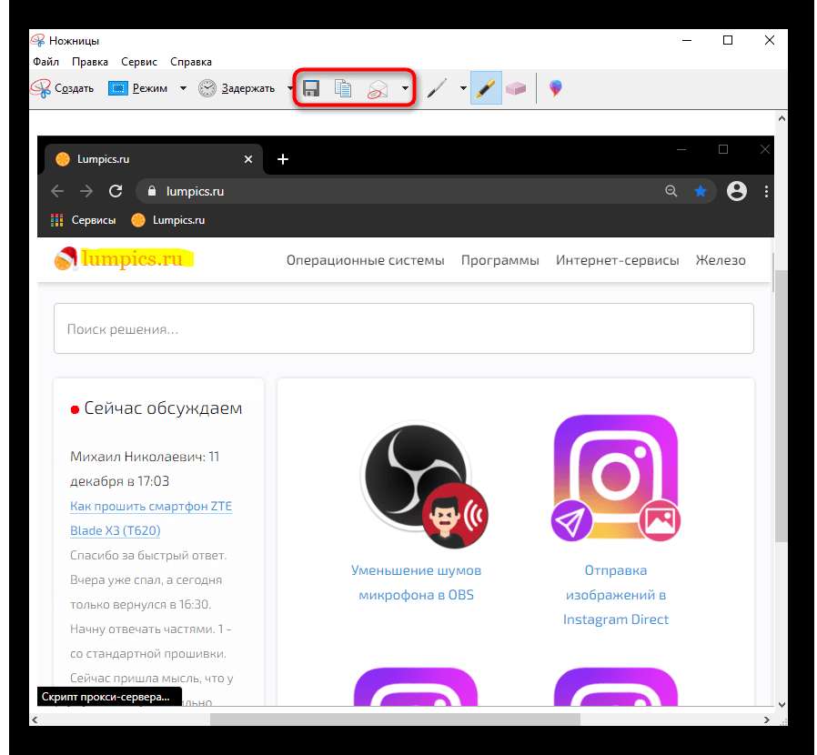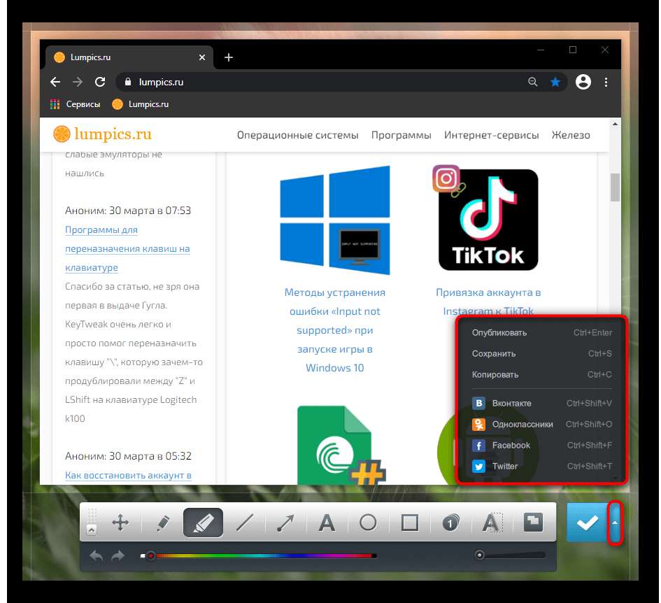 Нажимаете в меню «создать» и после этого станет доступно меню с выбором формы сохраняемого изображения. Вы выбираете что хотите. После этого вы можете обработать изображение, доступные инструменты видны в меню. Там все интуитивно понятно, с помощью «Маркера» делаете выделения нужного участка на изображении, а с помощью «Пера» делаете записи на скриншоте. После этого или сохраняете скрин или отправляете по почте прямо из программы.