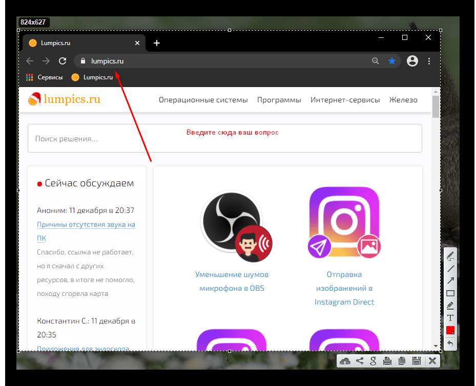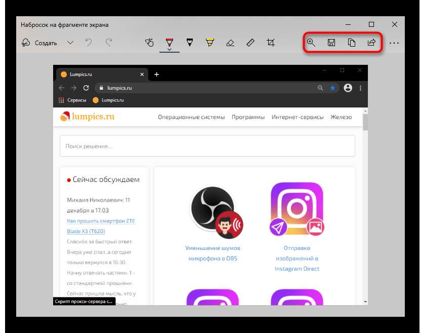 Далее расположены значки кадрирования и редактирования, позволяющие немедленно отредактировать только что сделанный снимок экрана, обрезав его по размеру или используя различные инструменты редактирования, такие как перо и текстовые инструменты.