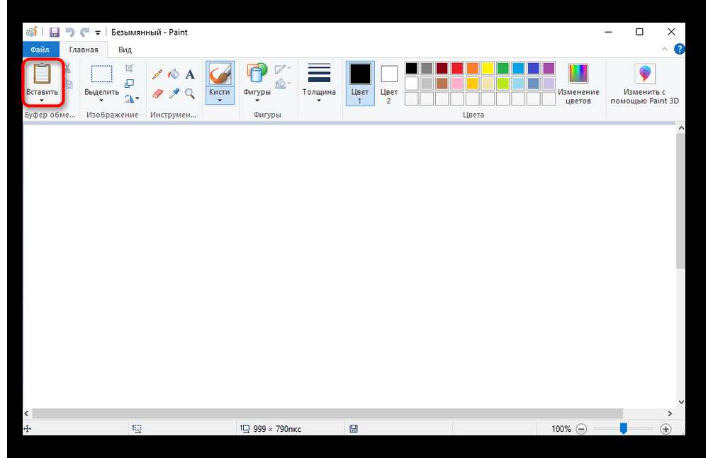 Открыв Paint, нажимаете в меню кнопку «Вставить», или комбинацию клавиш Ctrl+V, или в контекстном меню нажать «Вставить».