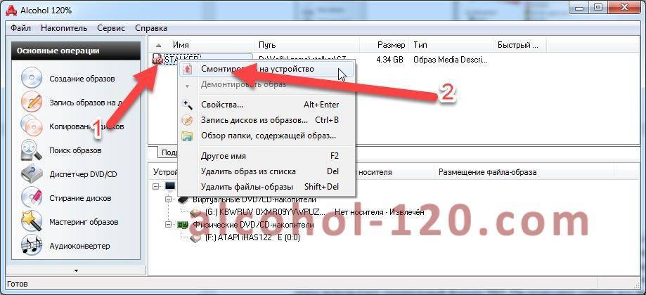 - После, правой клавишей мыши нажимаем на нужный образ, в выпадающем окне наводим курсор мыши на «смонтировать на устройство» и в следующем выпадающем окне выбираем виртуальный привод.