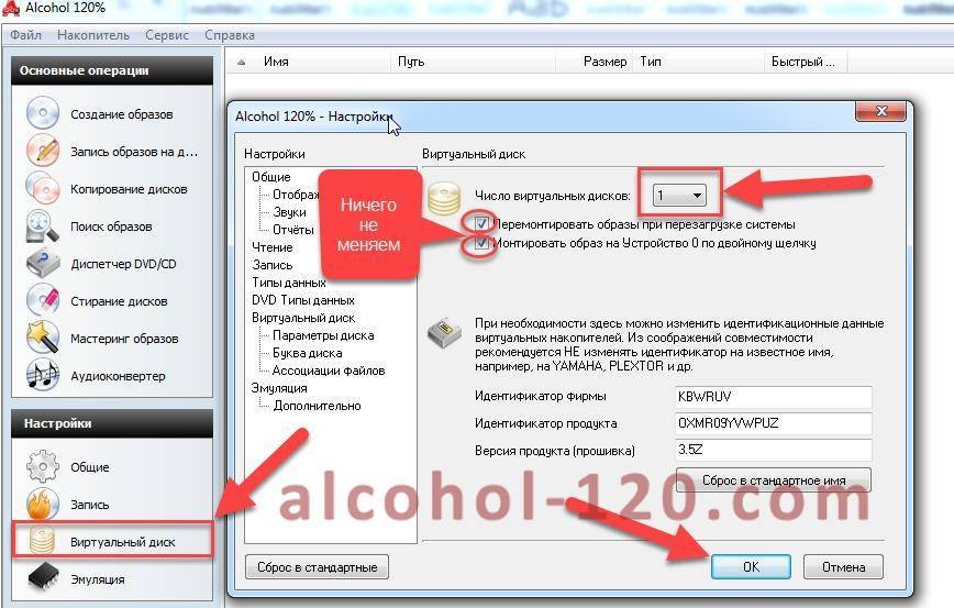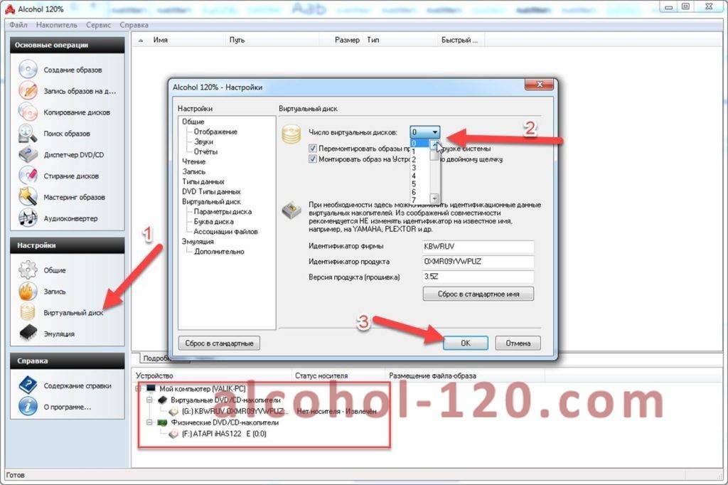 - Открываем Аlcohol 120%, и в левой части находим «настройки». Там нажимаем «виртуальный диск», и в открывшемся окне выставляем необходимое количество дисков. В полной версии их максимум 31, в пробной, рассчитанной на 15 дней использования — 6.