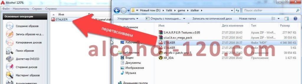 Для чего нужна данная утилита чаще всего? – конечно же для установки игр, сейчас мы и разберёмся как установить игру. В первую очередь запустите приложение, также откройте папку где находится образ игры и перетащите значок в свободное поле Алкоголя.