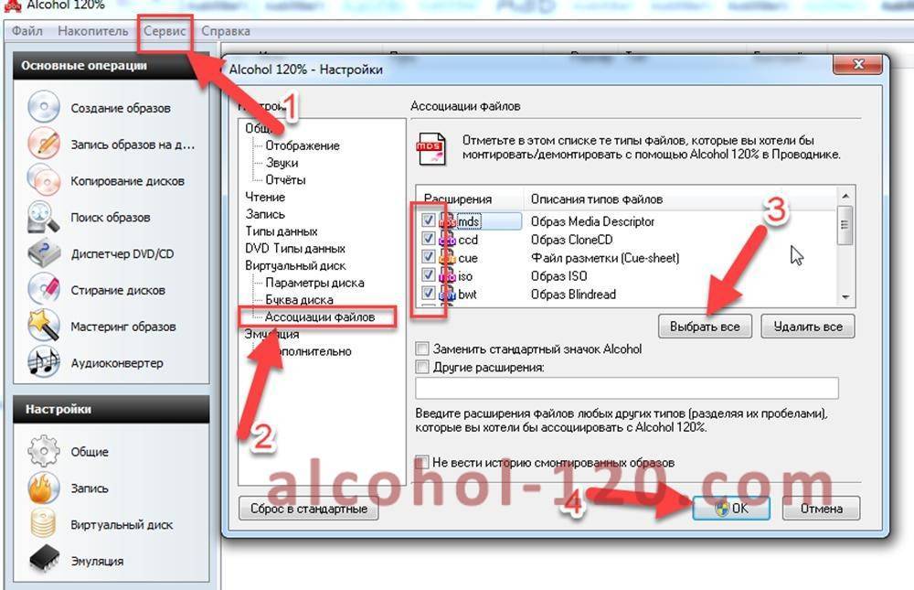 Перед тем как создать эмулятор, необходимо немного настроить программу, чтобы она работала со всеми форматами дисков. Для этого перейдите в раздел «Сервис» > «Настройки». В появившемся окне найдите вкладку «Ассоциации файлов» и поставьте галочки для всех форматов.