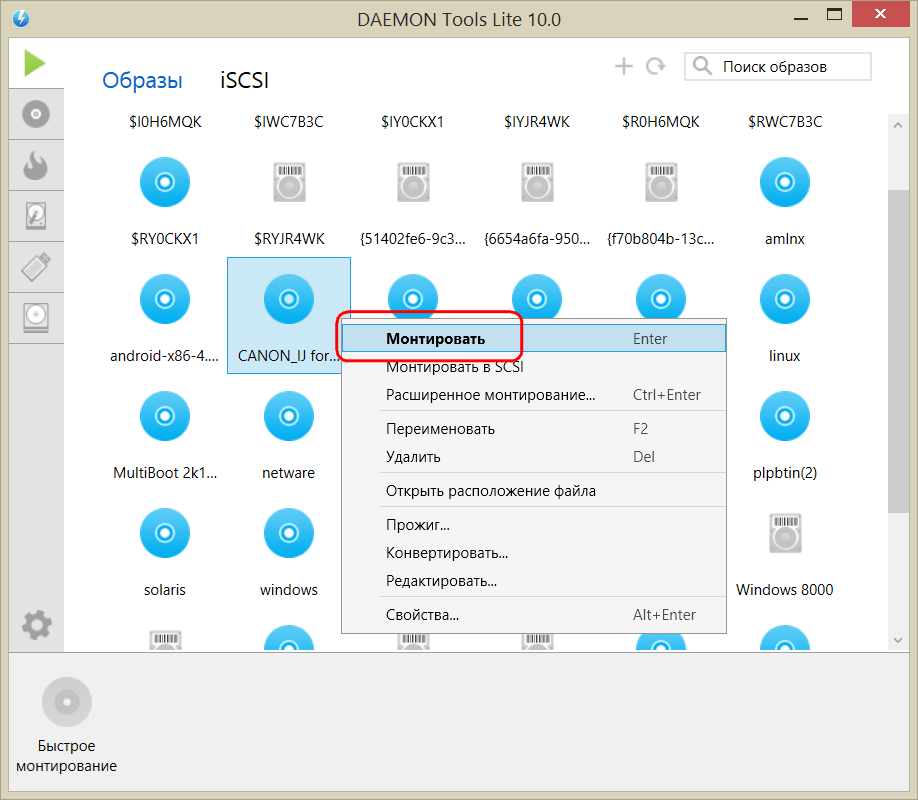 Как и прежде, образы дисков в интерфейс Daemon Tools можно добавлять по одному кнопкой быстрого монтирования.