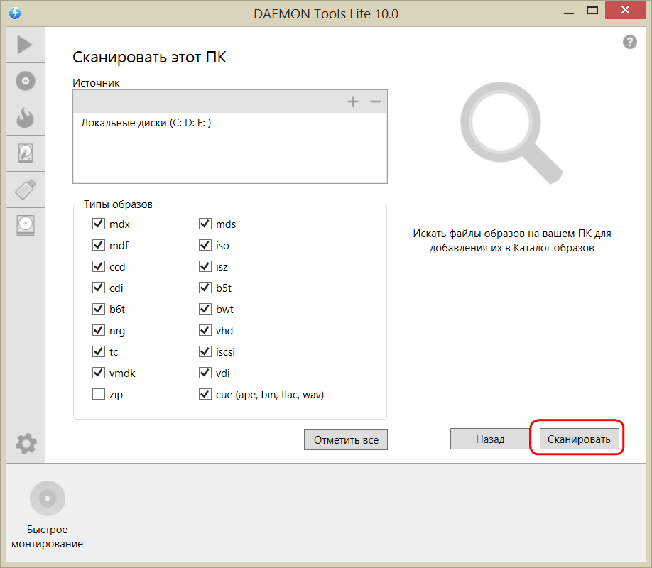 В числе новшеств версии Daemon Tools – опция сканирования компьютера на предмет обнаружения образов дисков и отображение их во внутренней библиотеке. Что же, воспользуемся этой возможностью.