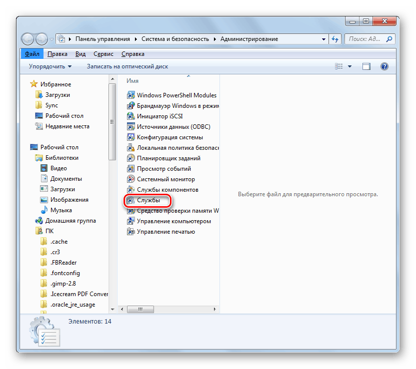 Выберите в списке инструментов наименование «Службы».