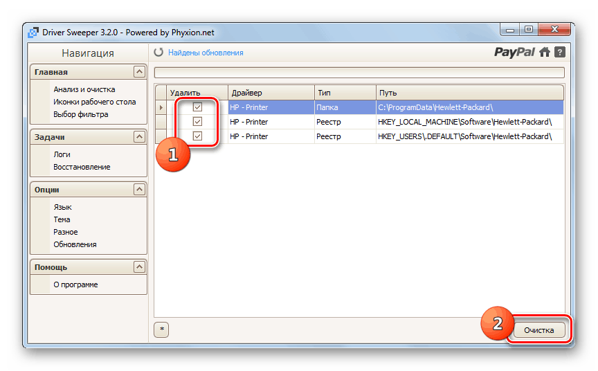 Откроется список драйверов, программного обеспечения и записей в реестре, которые относятся к выбранному принтеру. Отметьте все их галочками и нажмите кнопку «Очистка».
