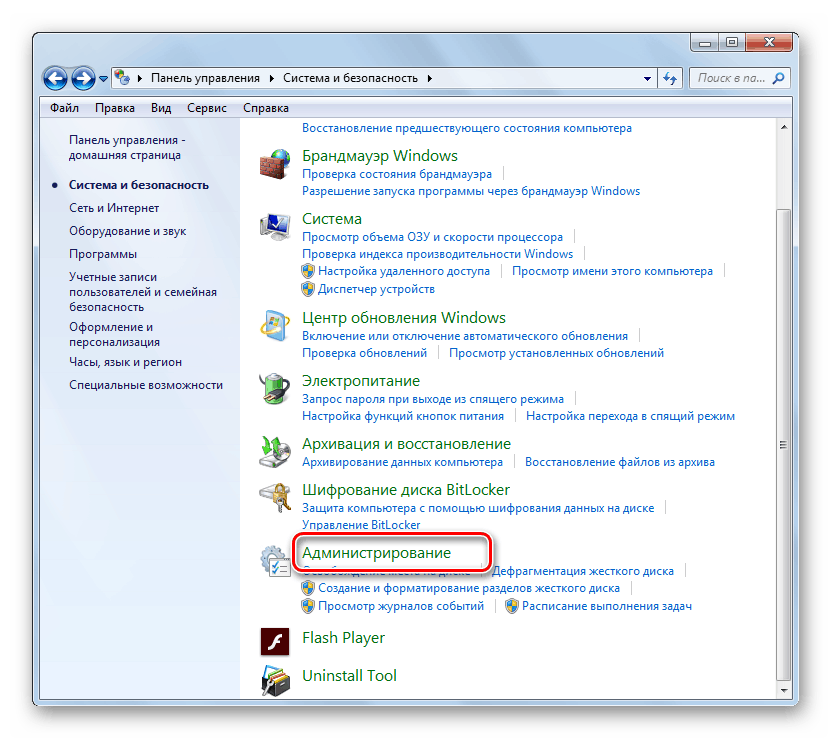 - В окне панели управления следует перейти в подраздел «Система и безопасность», а там, выбрать пункт «Администрирование».