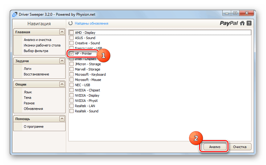 - Запустите Driver Sweeper и в окне программы в отобразившемся перечне устройств установите галочку напротив наименования принтера, который необходимо будет удалить. Затем нажмите кнопку «Анализ».