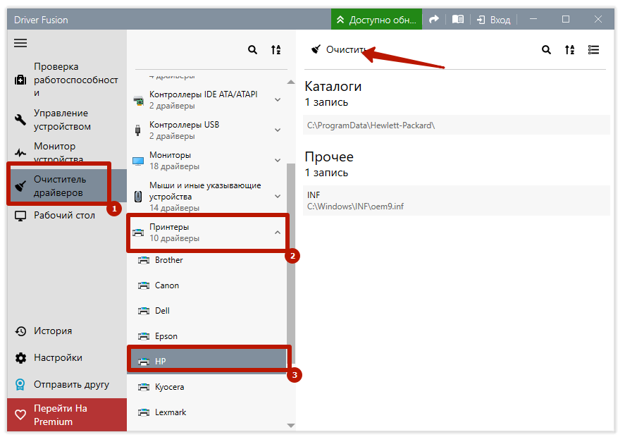 Переходим в раздел «Принтер». Увидим сортировку по производителям. Выбираете ваш бренд и жмете «Удалять». Программа зачистит систему ото всех следов принтера.