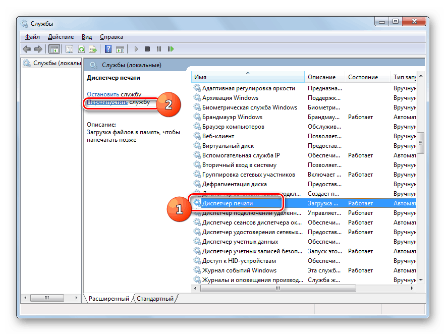 В отобразившемся перечне отыщите наименование «Диспетчер печати». Выделите этот элемент и щелкните «Перезапустить» в левой области окошка.