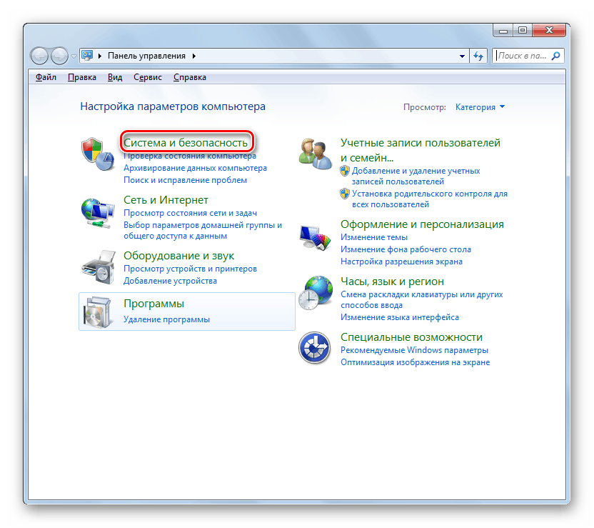 После того как оборудование удалено, нужно перезапустить службу, отвечающую за работу принтеров. Снова зайдите в «Панель управления», но на этот раз откройте раздел «Система и безопасность».