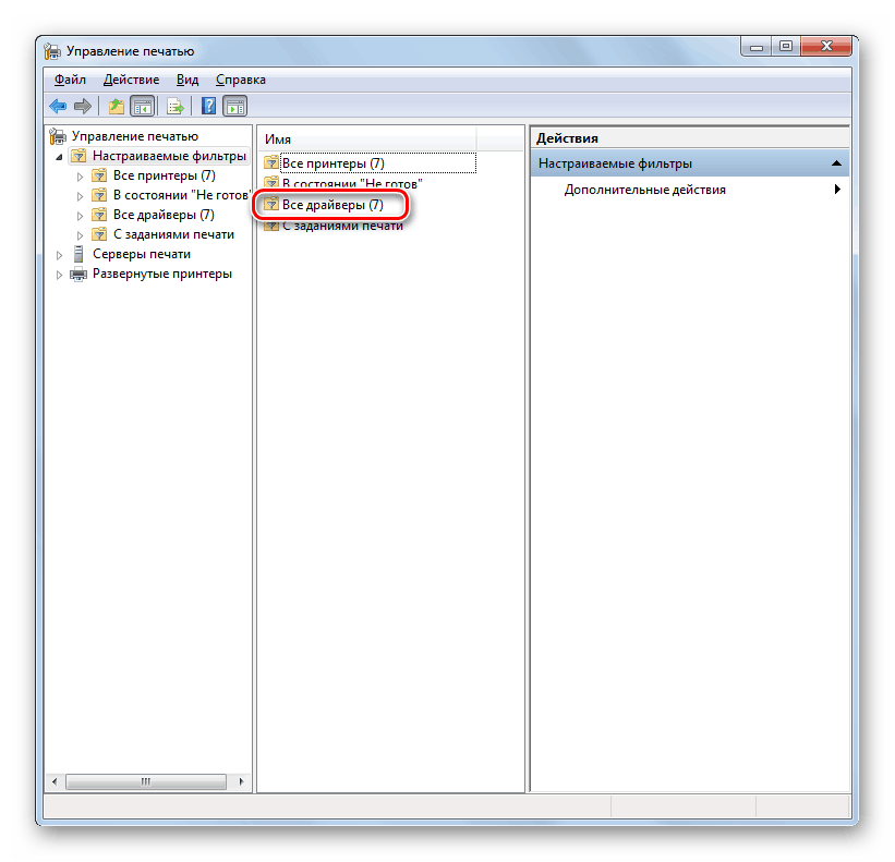 Данная оснастка представляет собой системный инструмент, позволяющий просматривать списки установленных принтеров, проверять их статус, задействовать или приостанавливать работу, использовать групповые политики и многое другое. Нас же интересует еще одна функция, управляющая драйверами.