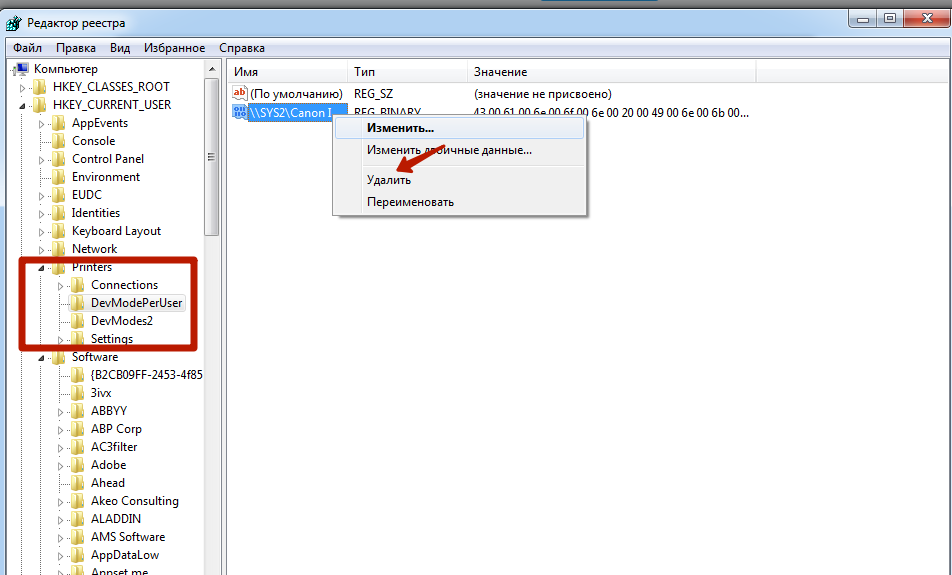 Удаление упоминаний о принтере в реестре