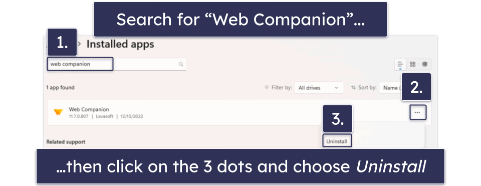 With the “Settings” window open, find the “Apps” entry on the left of the screen. Next, click on “Installed apps”. This should open a list of every program installed on your PC. Scroll through the list to find “Web Companion”, or simply search for it using the form at the top of the page. Click on the 3 dots to the right of the Web Companion entry, then select “Uninstall”.