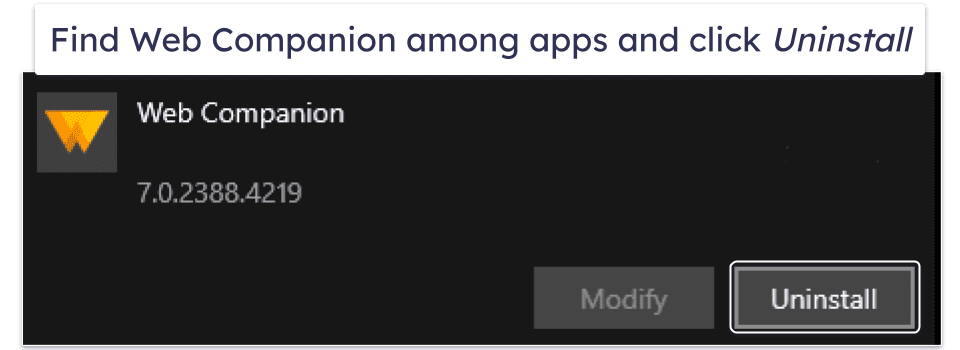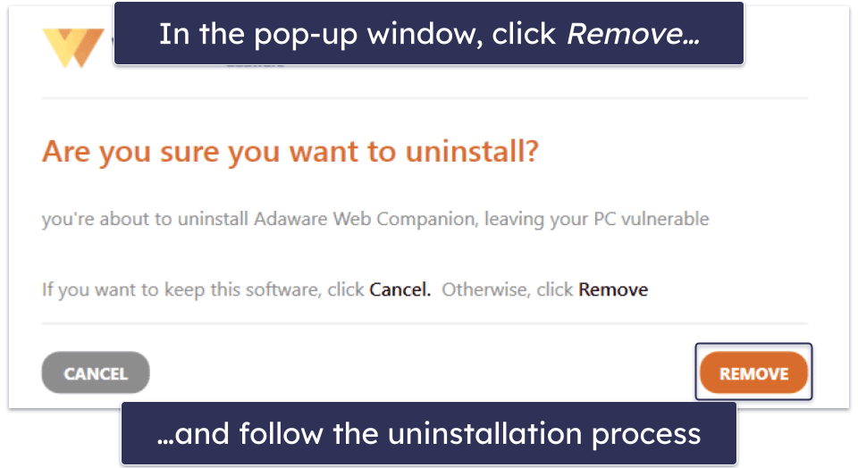 Web Companion will open an uninstaller app. Click the orange “Remove” button and follow the on-screen wizard. Once it’s finished, you will have removed Adaware Web Companion from your computer.