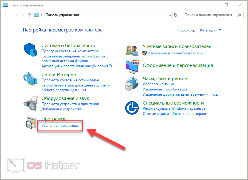 - Выберите тип просмотра «Категория» и откройте раздел «Удаление программы».