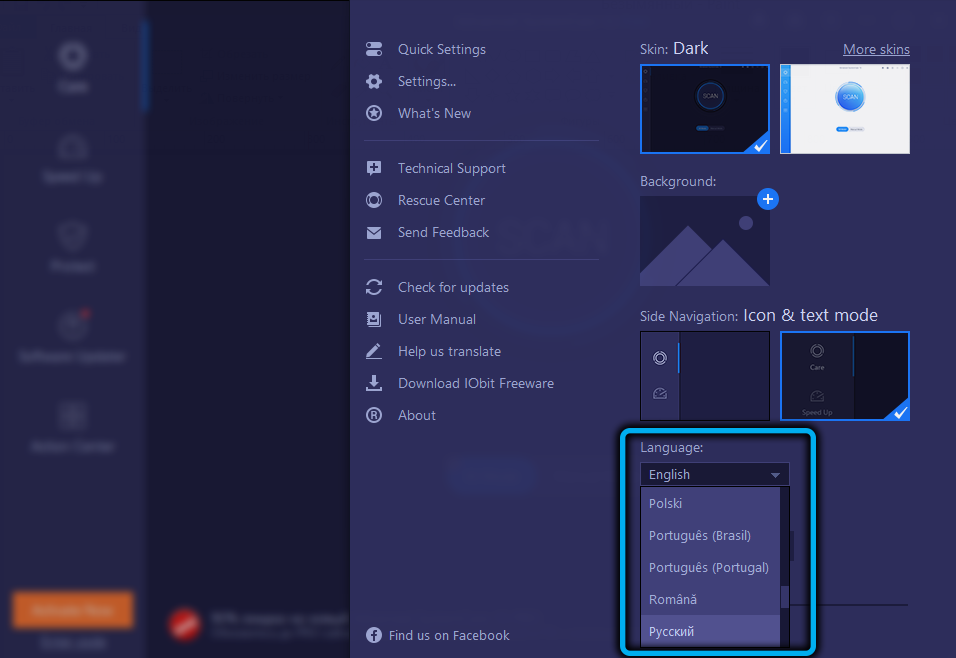 Она уже русифицирована, поэтому вопрос, как поменять язык Advanced SystemCare, может возникнуть только в тех случаях, когда вы загрузили приложение с сомнительного источника. Делается это очень просто, через кнопку «Меню», расположенную в верхнем левом углу главного окна (в виде трёх горизонтальных полосок), пункты Setting (Настройки) –>User interface (Пользовательские настройки)–>Language (Язык).