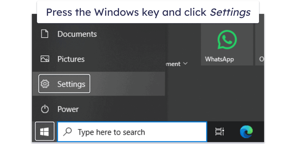 Click on the “Windows” icon on your taskbar. Next, click on the “Settings” icon, which also can be identified by a gear symbol.