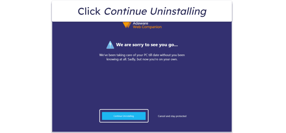 This will open the uninstaller app for Web Companion. Click on the button that says “Continue Uninstalling”, and the program will be removed. Adaware will claim it’s sad to see you go, but you’ll be happy to be rid of it.