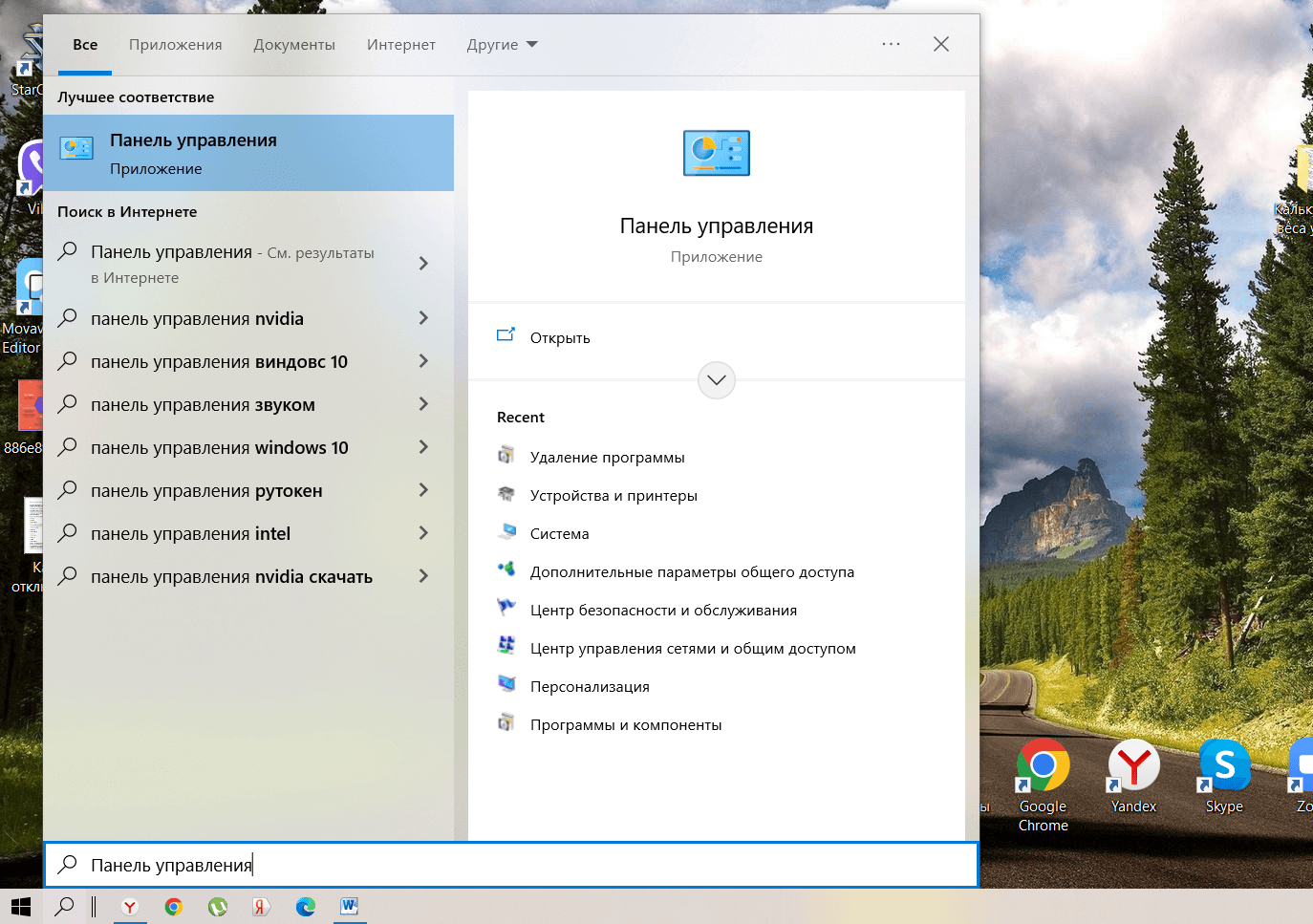 - Следует открыть панель управления (если на компьютере установлена ОС Windows 10, то для этого можно воспользоваться системой поиска, введя в нее «Панель управления»).