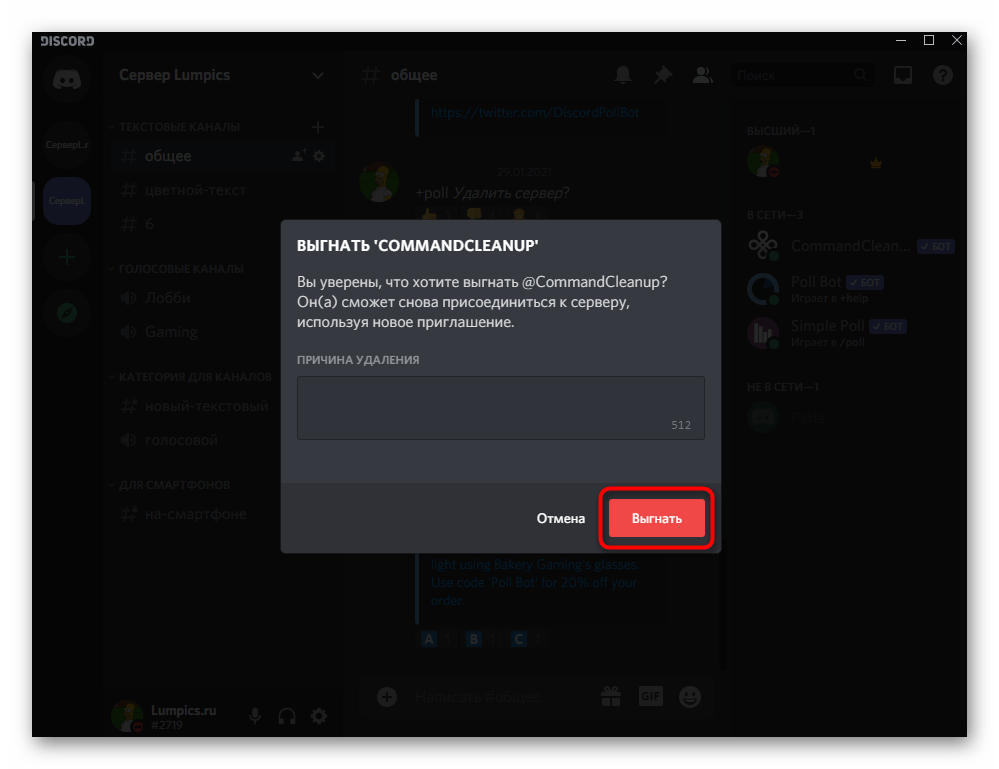 Подтвердите удаление, ещё раз нажав «Выгнать». Объяснять причину вашего решения необязательно.