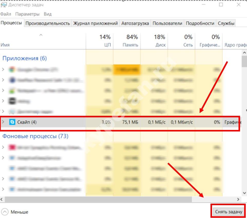 Во вкладке «Процессы» находим в списке Скайп и снимаем задачу (завершаем процесс).