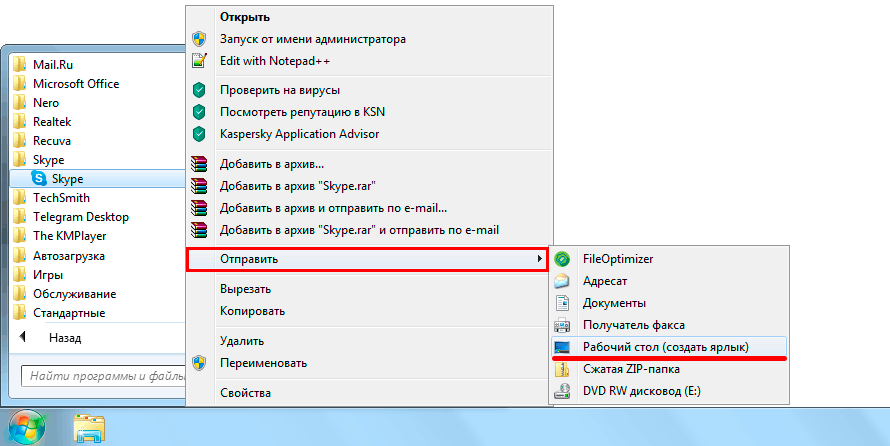 2. Выносим ярлык на Рабочий стол: Пуск → Программы → ПКМ по скайпу → Закрепить на стартовом экране или Отправить → Рабочий стол – создать ярлык.