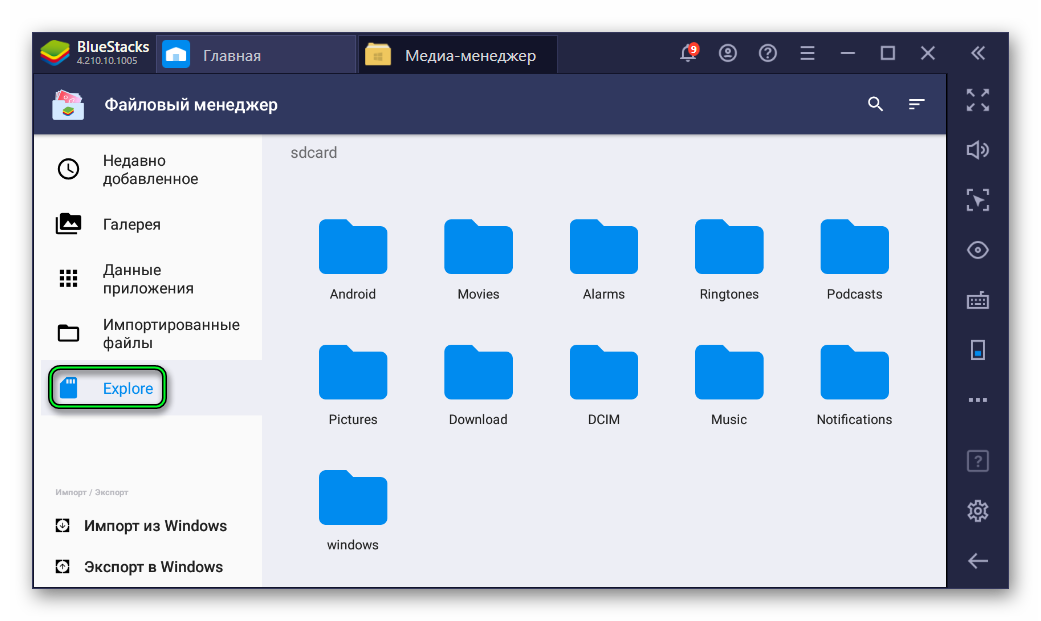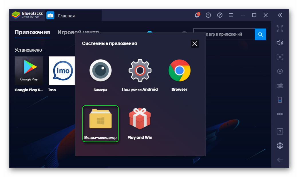 У виртуального устройства Андроид своя файловая система. Просмотреть ее содержимое получится через «Медиа-менеджер», расположенный в каталоге «Системные приложения» на рабочем столе Блюстакс.