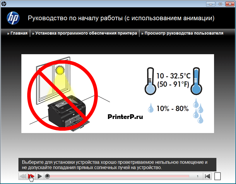 Обязательно потребуется просмотреть обучающее видео с руководством по условиям размещения принтера. Для этого жмем на красный треугольник слева снизу.