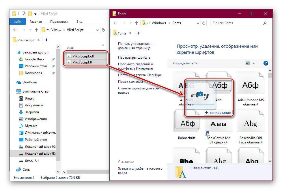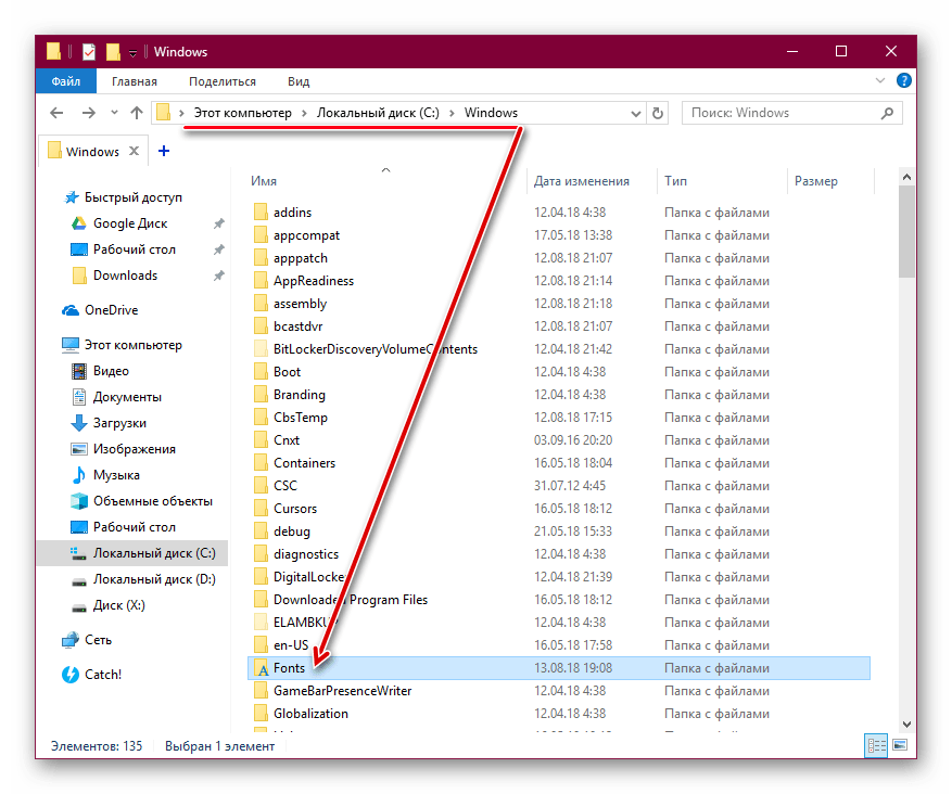 Открыть папку «Fonts» в «Проводнике» Windows и перетащить в нее файл шрифта.