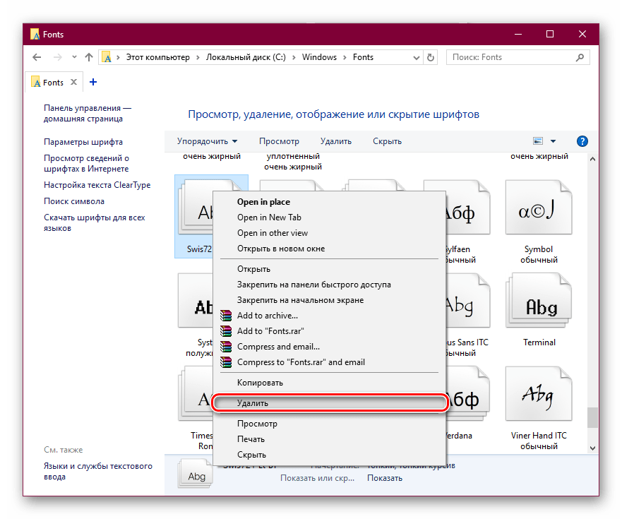 Точно таким же образом можно устанавливать шрифты и других расширений, например, OTF. Удалять варианты, которые вам не понравились, очень просто. Для этого зайдите в , отыщите название шрифта, кликните по нему правой кнопкой мыши и выберите «Удалить».