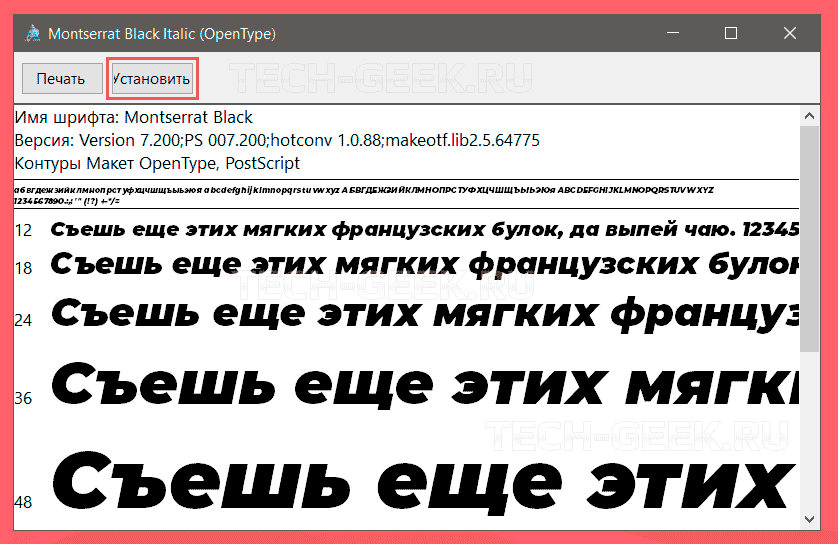 Дважды щелкнуть по файлу левой кнопкой мыши. Откроется окно с информацией о шрифте — его именем и примером начертания. Для добавления шрифта в систему нажимаем кнопку «Установить» на панели в верхней части окна.