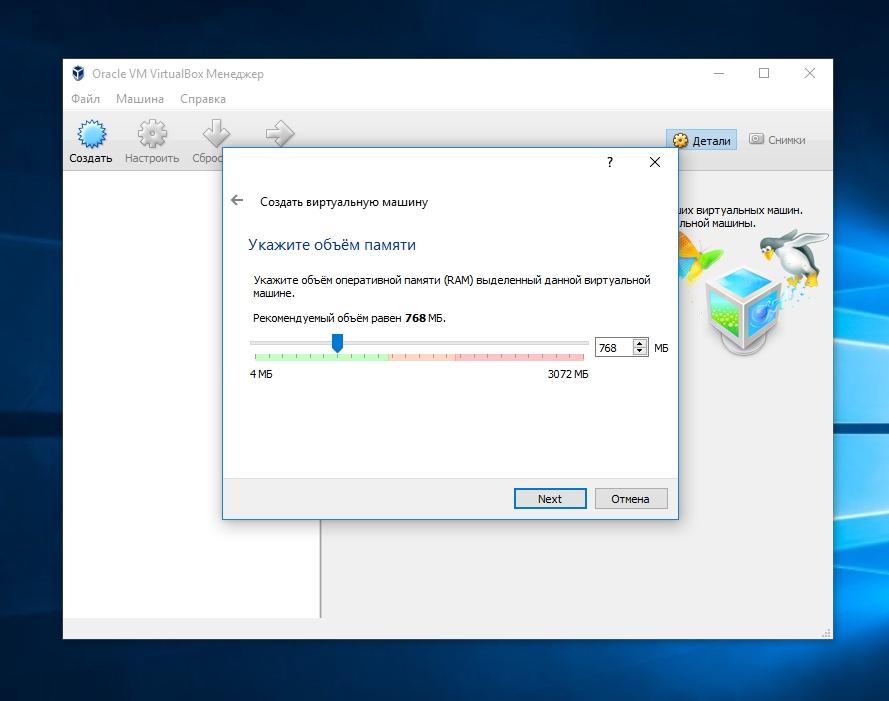 Теперь укажем объем памяти, выделяемой для нашей виртуальной машины.