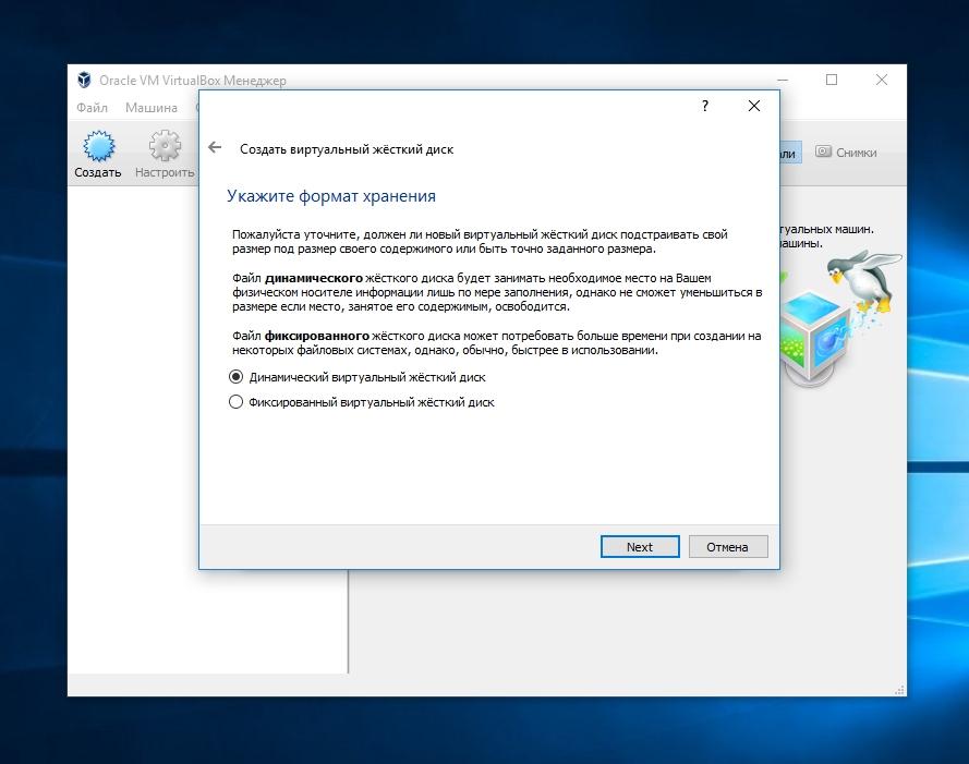 Создадим динамический жесткий диск, который будет заполняться по мере записи на него информации, затем нажмем клавишу Next