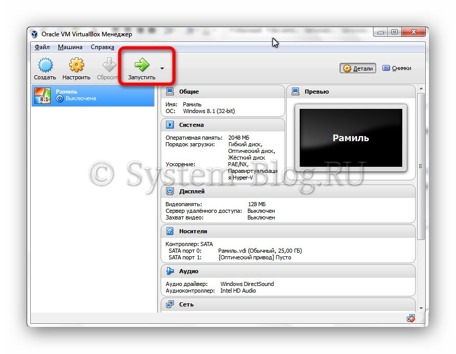 Итак, чтобы поставить на виртуальную машину Windows или другую ОС, нужно сначала её включить. Для этого нажмите кнопку «Запустить».