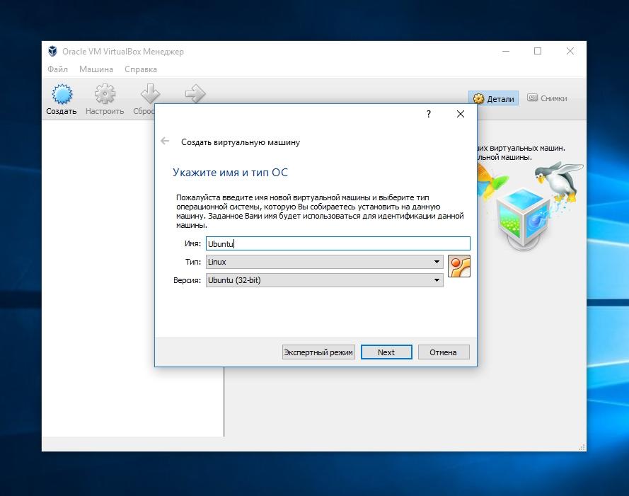 Теперь разберемся с таким наболевшим вопросом, как установить виртуальную машину на Windows 10. Для этого запускаем VirtualBox и нажимаем кнопку «Создать». В появившемся окне создаем имя виртуальной машины. Тип системы выбираем Linux, версию Ubuntu и переходим к следующему шагу.