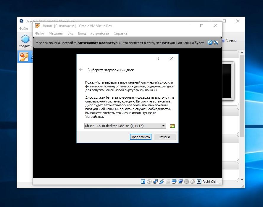 Создание нашего виртуального Linux компьютера закончено, теперь можно его запустить, кликнув по зеленой кнопке «Запустить». При запуске виртуальная машина предложит вам выбрать загрузочный диск. Выберите загрузочный диск ubuntu-15.10-desktop-i386.iso, который мы ранее скачали и нажмите Продолжить.