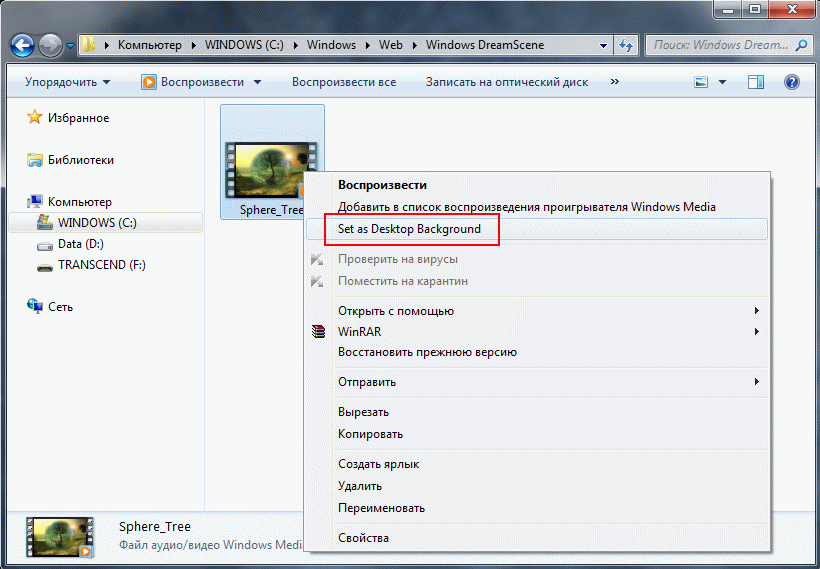 Добавление анимированных картинок производится аналогичным образом: нажмите на загруженный файл правой кнопкой и выберите пункт «Set as Desctop Background».