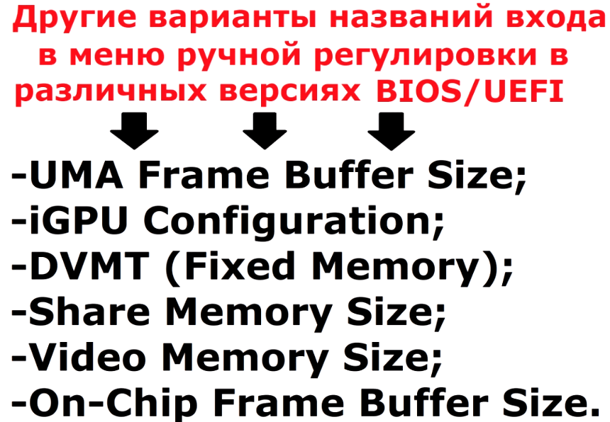 Есть второй способ сделать эту задачу, используя. Нужно зайти в биос (сейчас это уже UEFI на всех современных материнках). Перезагрузите ваш компьютер и нажмите во время загрузки клавишу F2 или Del. Теперь нам нужно найти настройки. В зависимости от производителя материнской платы, путь может быть разным. Обычно это нечто в духе: Advanced — Video/Graphics settings либо VGA Share Memory Size, либо UMA Frame Buffer Size, либо Share Memory.