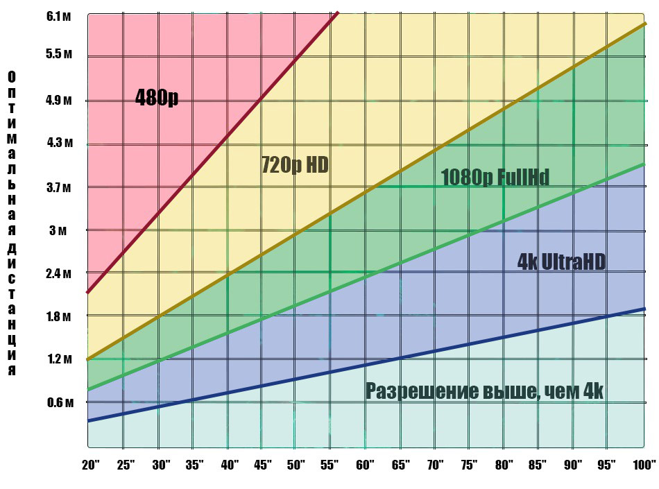 Идеальная дистанция зависит от разрешения экрана и ваших задач. Согласно исследованиям человеческого поля зрения, рекомендуется смотреть так, чтобы монитор занимал около 30° вашего обзора. Для просмотра фильмов с ощущениями, как в кино, хорошо подойдёт 40°. На основании этого мы составили таблицу оптимального расстояния телевизора в зависимости от расстояния. Воспринимайте информацию, как примерную рекомендацию для комфортного просмотра.