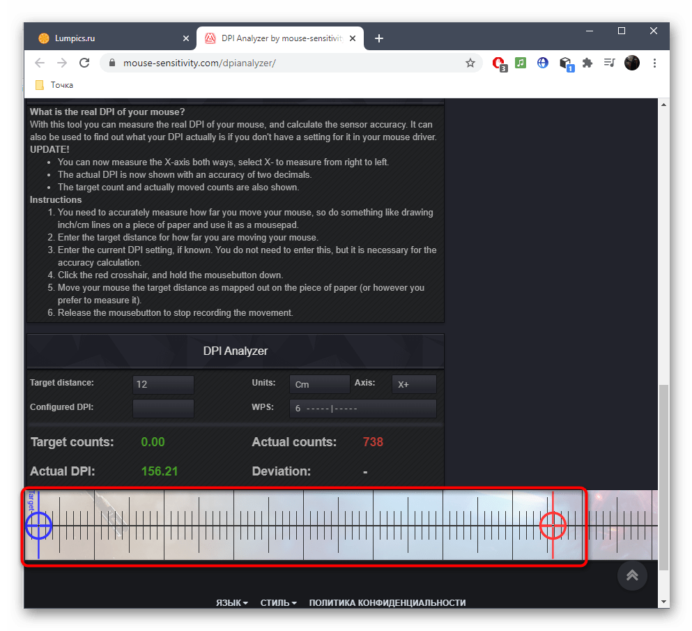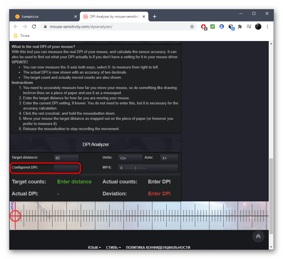 Теперь, когда с предварительными настройками закончено, можно переходить непосредственно к работе с единственным в своем роде сайтом Mouse-Sensitivity, который и позволит проверить DPI мышки. В нем понадобится задать некоторые настройки, после чего можно приступать к тестированию.