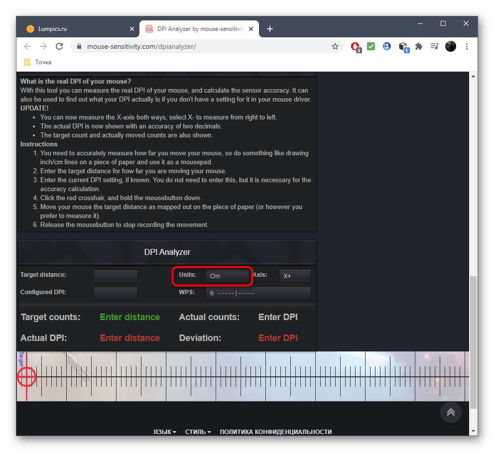 Откройте сайт Mouse Sensitivity, где начала задайте единицы измерения в сантиметрах.