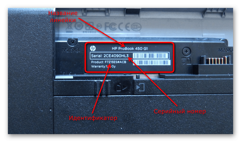 Помимо этого, у многих старых ноутбуков сведения могут находиться и вовсе под аккумулятором. Конечно же, для того чтобы их просмотреть, следует обесточить ноутбук, при помощи защелок снять аккумуляторную батарею и поискать интересующий текст. Пример такого расположения названия вы видите на фото.