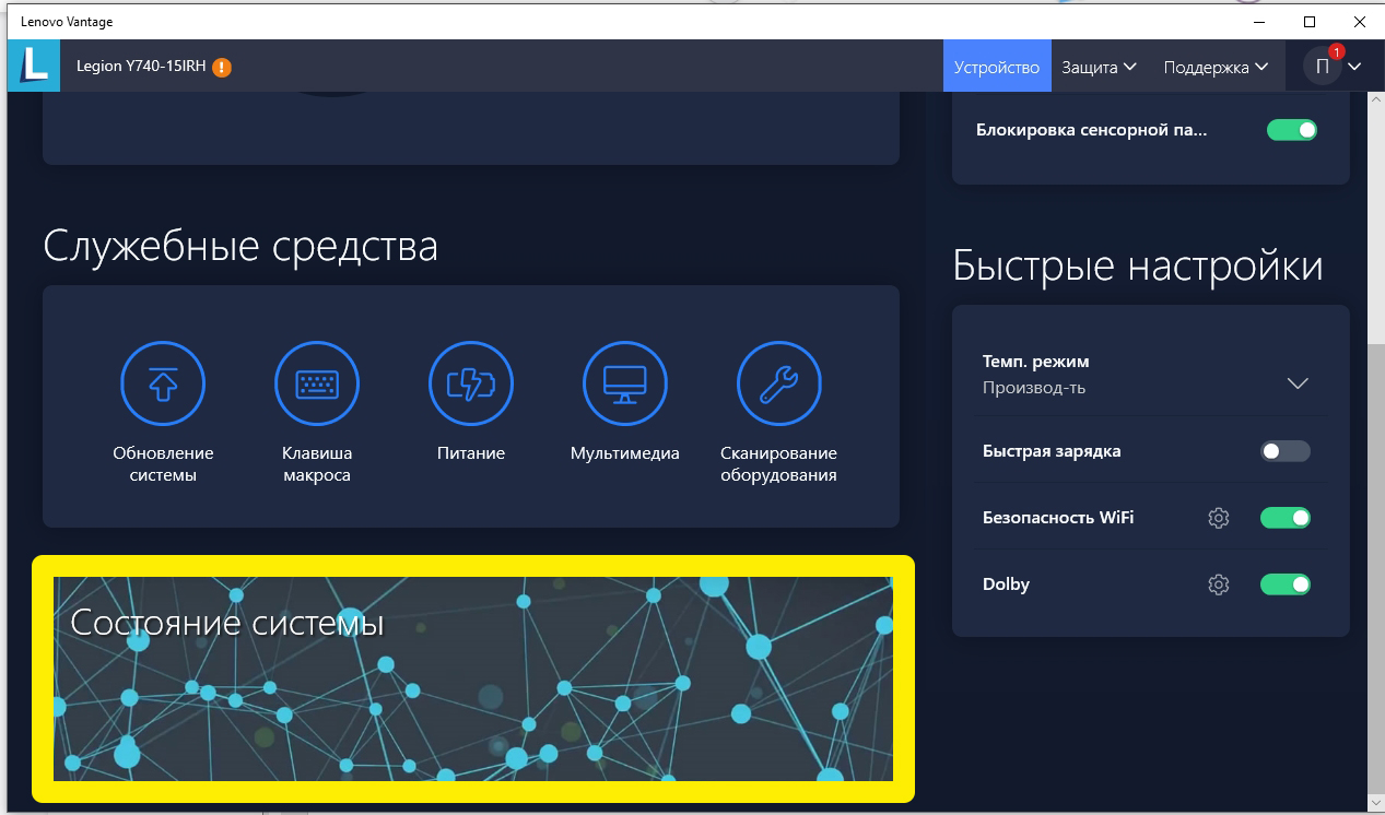 У Lenovo – это программа «Lenovo Vantage». После открытия жмем по разделу «Состояние системы».