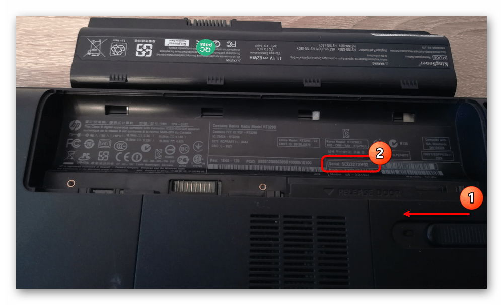 Если у вас старый ноутбук, где снимается аккумулятор, можете посмотреть серийный номер и под ним. Эту информацию раньше часто наносили прямо в углубление, отведенное под батарею, благодаря чему владельцы лэптопа могли узнать данные о нем в случае, если сняли наклейку или текст на ней стерся. Снимите аккумулятор, сдвинув защелку в сторону, и поищите уже упомянутое название строки.