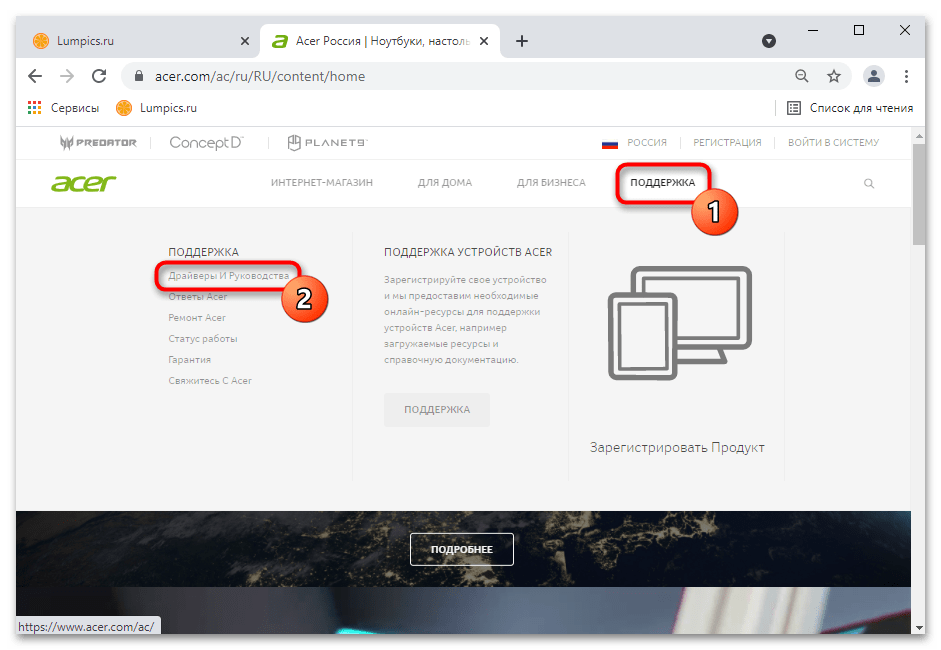 - Откройте ссылку выше и последовательно зайдите в «Поддержка» >«Драйверы и Руководства».
