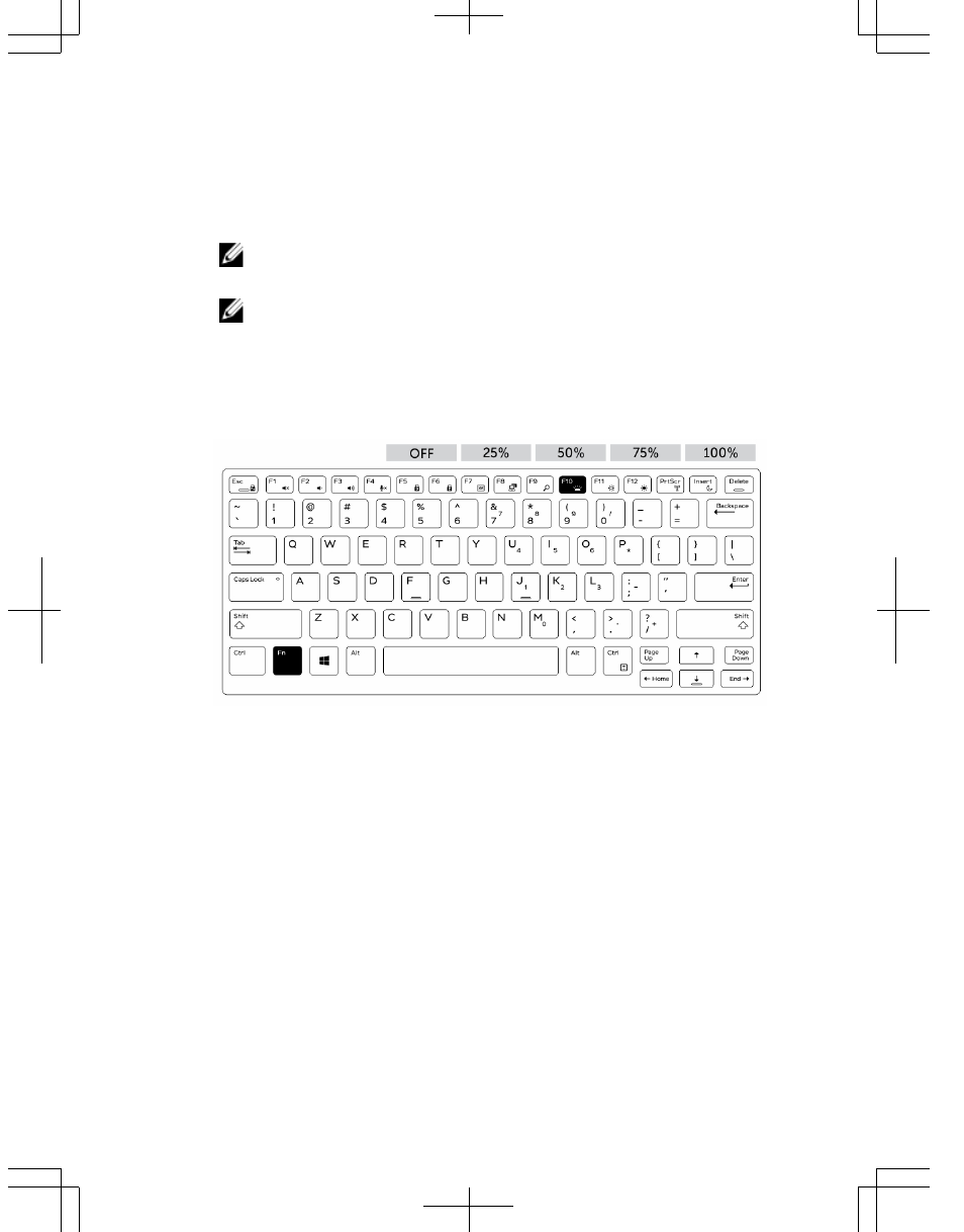 - Повторное нажатие комбинаций клавиш циклически меняет настройки яркости на 25, 50, 75 и 100 процентов.